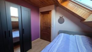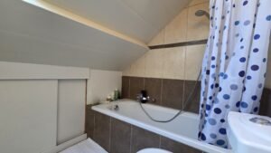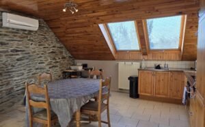 Hall d’entrée, séjour avec coin cuisine équipée (taque électrique, frigo, four, évier, hotte), salle de bains (baignoire, WC, évier), buanderie, chambre, grenier à l’étage.Quelques renseignements complémentaires :
