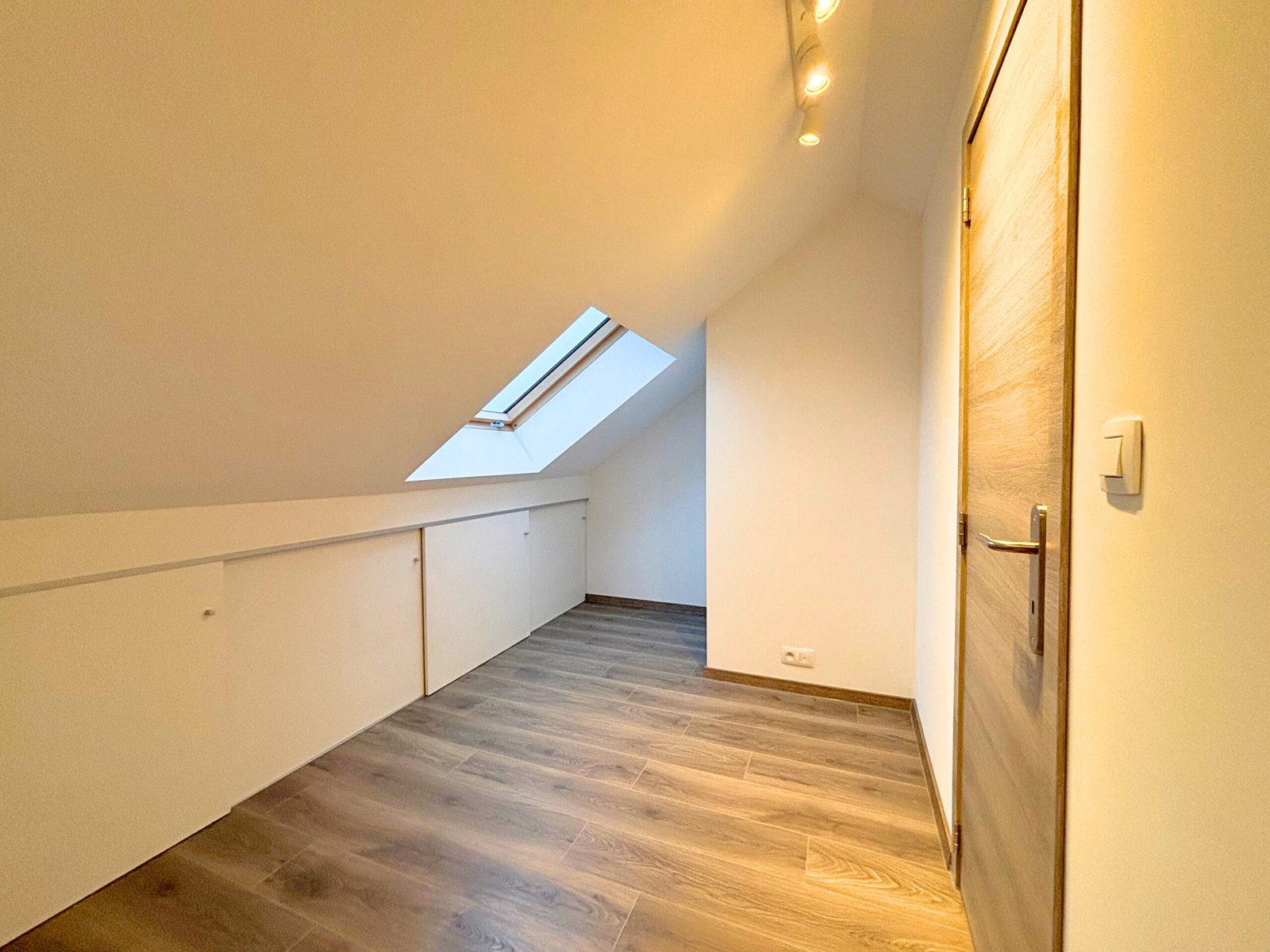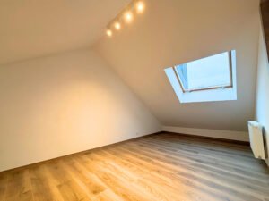 Verdieping : één slaapkamer, badkamer (douche, lavabo, toilet) en klein bureau/dressing.