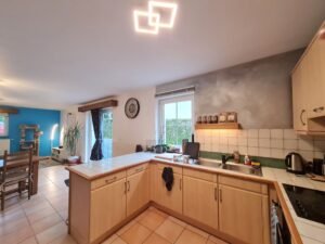 Hall d’entrée, spacieux séjour (salon + salle à manger), cuisine semi-équipée (vitrocéramique, four, hotte, évier), 2 chambres, salle de bains (baignoire/douche, lavabo, WC), buanderie et WC séparé.