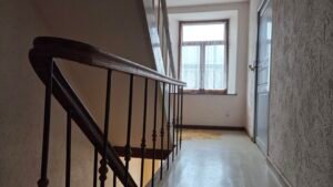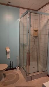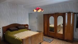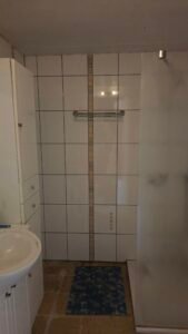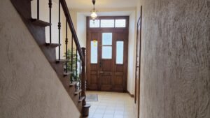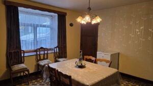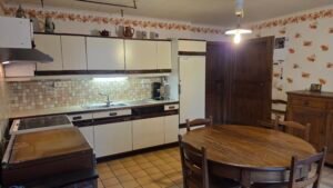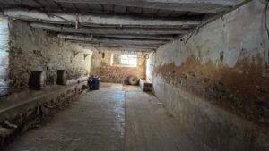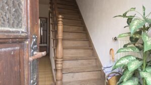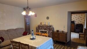 Hall d’entrée, cuisine semi-équipée, salle à manger/salon, bureau/chambre, couloir avec 2ème entrée, escalier et coin buanderie, salle de bains (douche, lavabo, WC), couloir donnant accès au jardin et à une étable de +-38m².