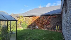 Toiture en ardoises naturelles (toiture grange côté jardin à rénover), châssis en bois avec double et simple vitrage, installation électrique non conforme, chauffage central au mazout, alarme, raccordement égout communal, …PEB : Classe F