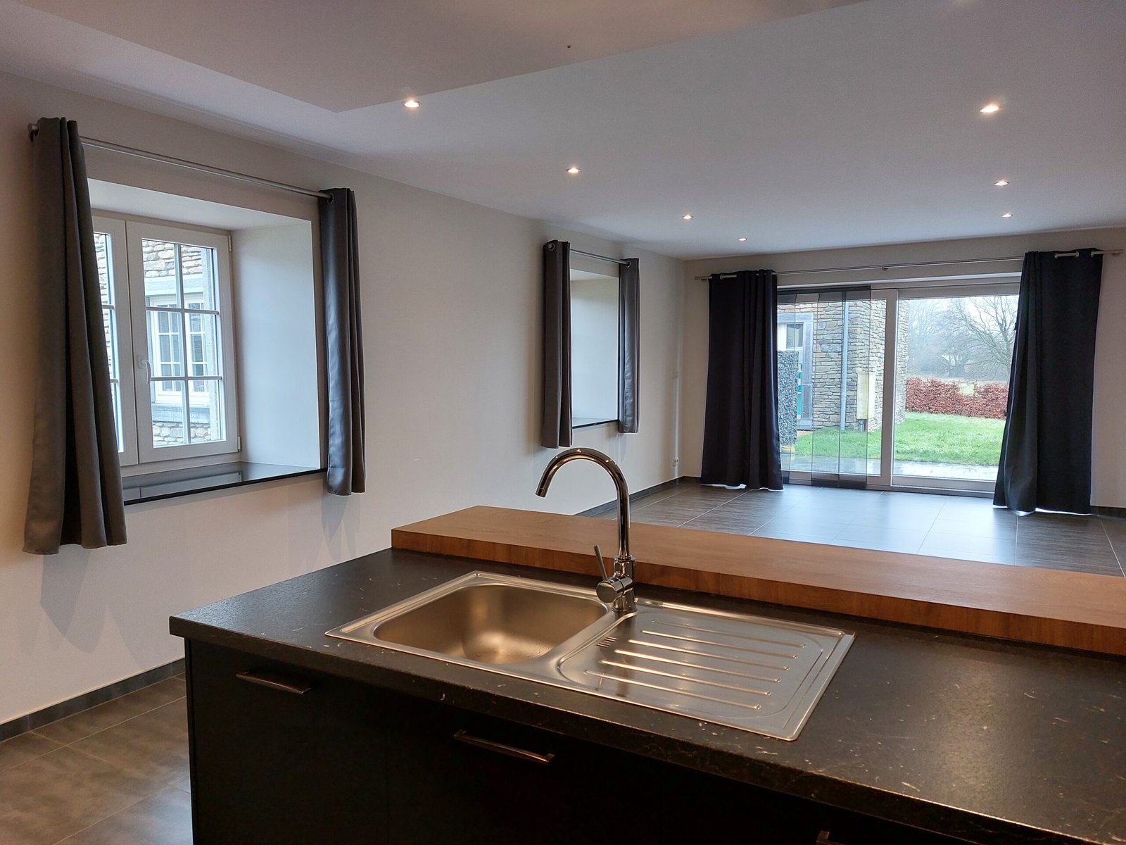 Hall d’entrée, séjour avec cuisine équipée (taques vitrocéramiques, four, hotte, lave-vaisselle, évier, frigo, congélateur) et accès à la terrasse, WC, débarras.