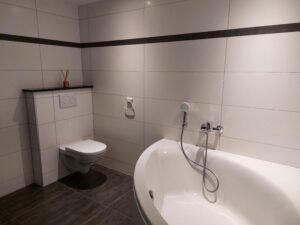 Hall, 1ère chambre, bureau, salle de bains (douche italienne, baignoire, évier, WC), buanderie.
