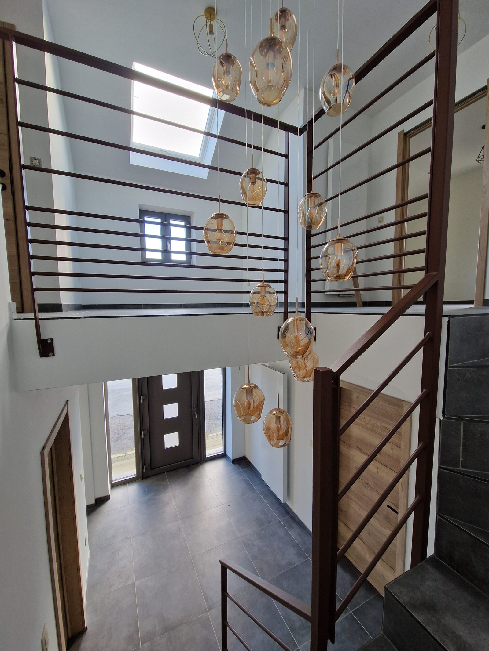 Châssis ALU avec double vitrage isolant, chauffage central au gaz, façades en pierre de pays et crépis isolant, toiture en ardoises artificielles, station d’épuration individuelle, citerne de récupération d’eau de pluie (10.000L), ...PEB : nouvelle construction / déclaration finale à réaliser en fin de travaux.