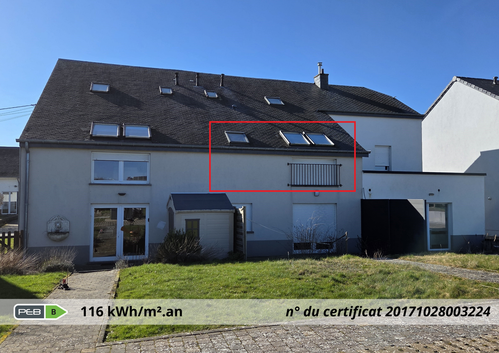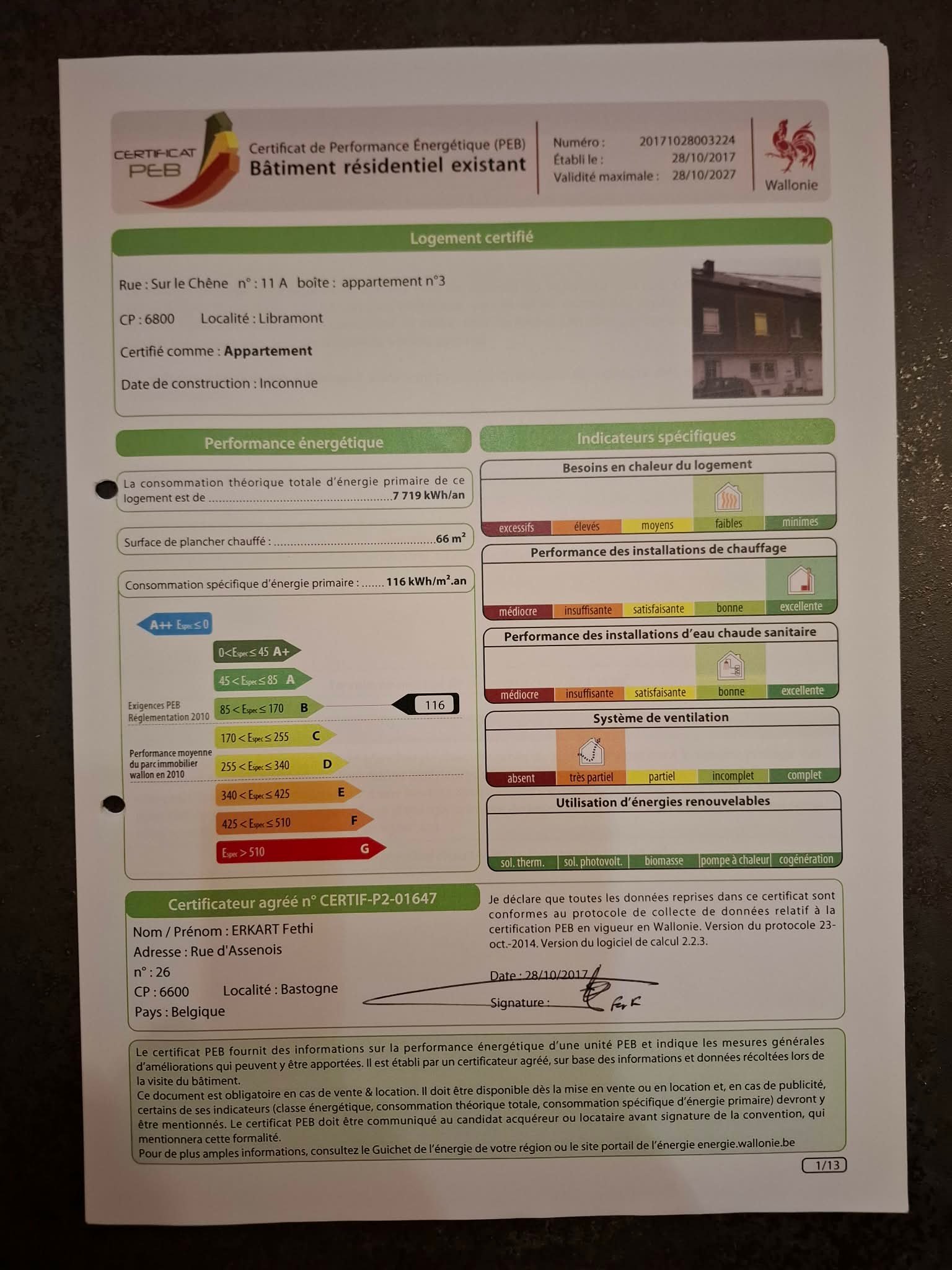 - EPC: PEB : Classe B - Consommation spécifique d’énergie primaire : 116 kWh/m².an - N° du rapport PEB : 20171028003224