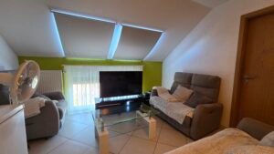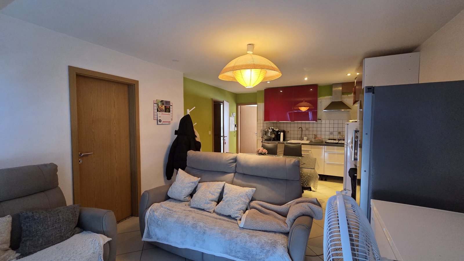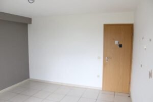 Inkomhal, woonkamer (+-25m²) met keukenhoek, 2 slaapkamers, 1 badkamer (douche, lavabo, WC, washoek).