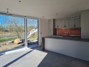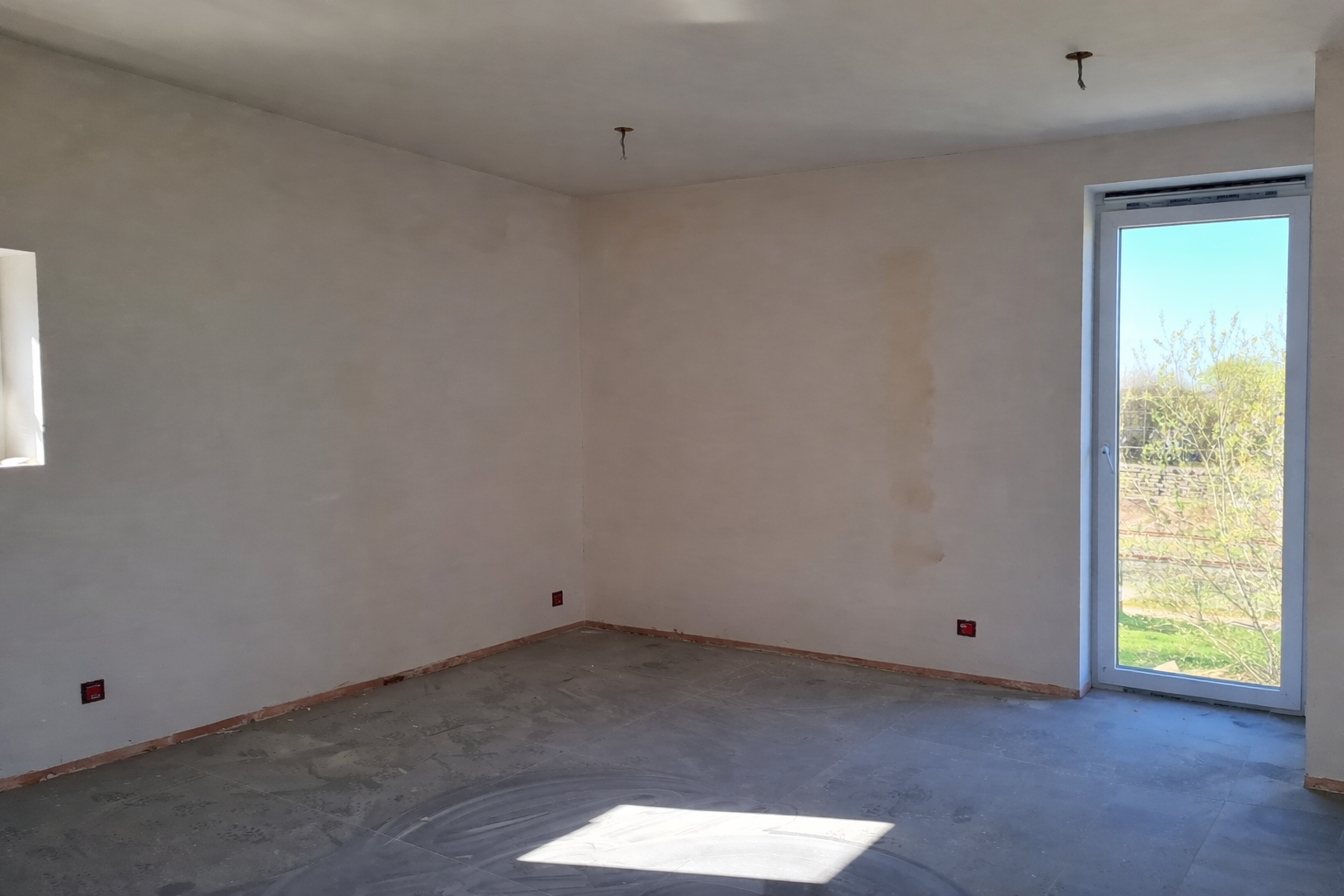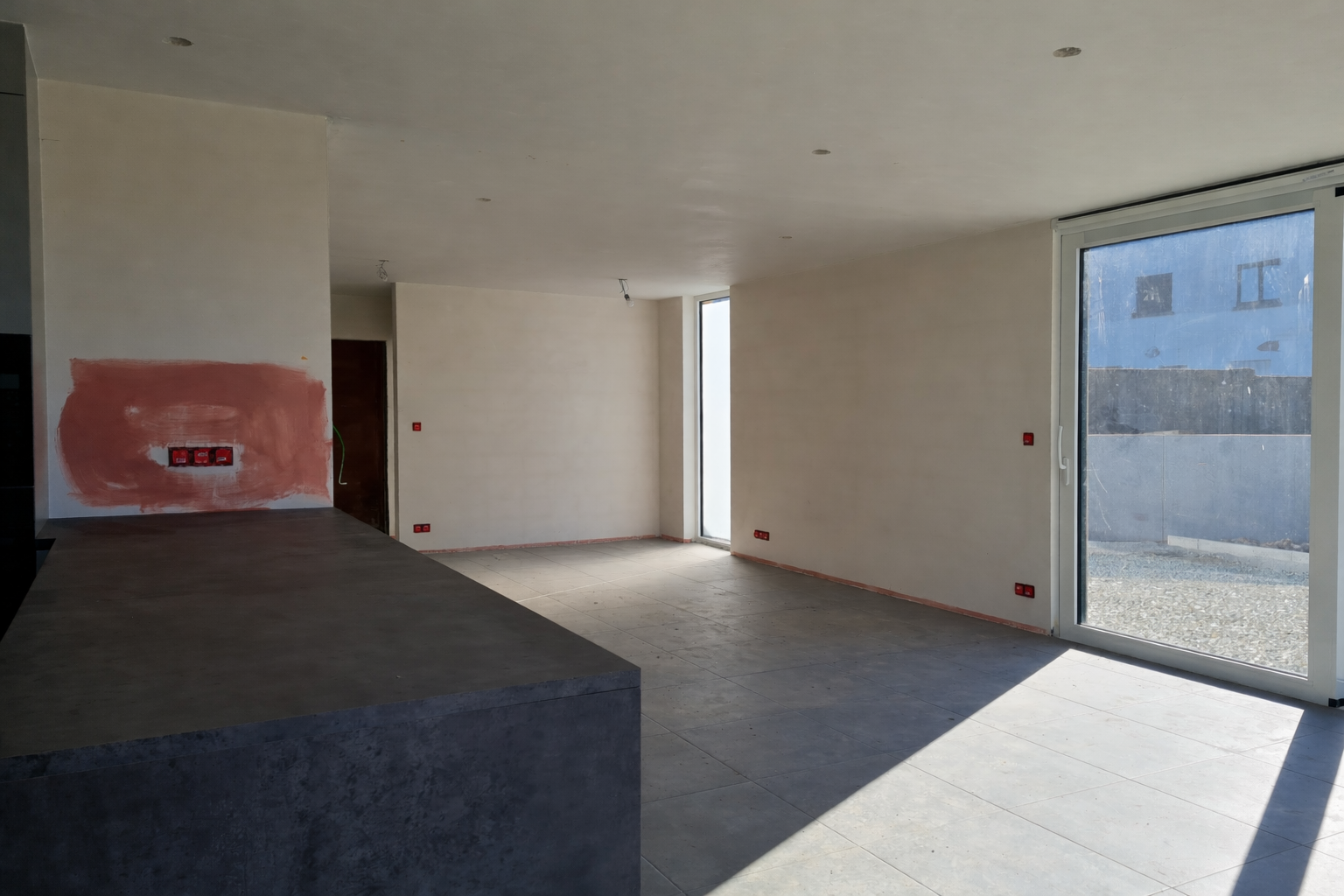 Spacieuse et lumineuse pièce de séjour avec accès vers la terrasse et le jardin, cuisine entièrement équipée, buanderie avec accès vers la terrasse, WC.