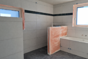 Grande chambre (+/- 17m²) et salle de bains (baignoire, douche, lavabo sur meuble, WC).