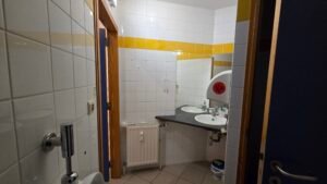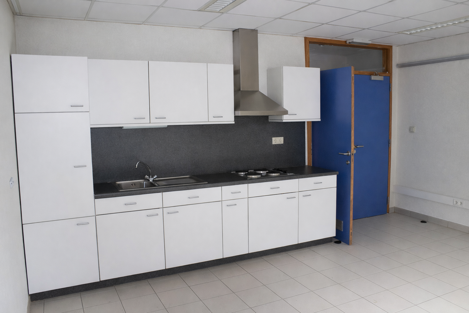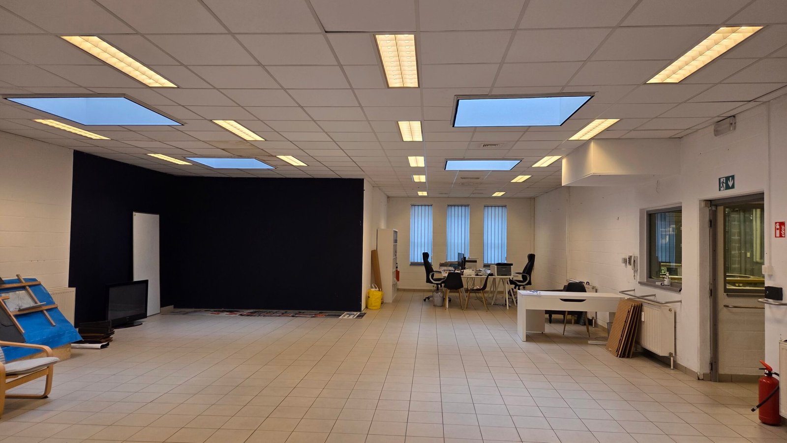 Grand espace bureau/commerce (+-140m²), cuisine semi-équipée, 4 pièces/bureaux, buanderie et WC/sanitaires.