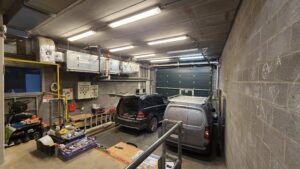Grand garage avec porte sectionnelle électrique et monte-charge.