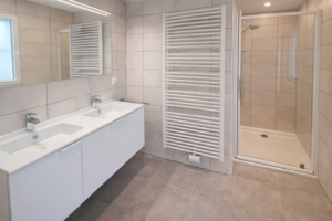 Hall d’entrée, 3 chambres dont une avec salle de douche privative (meuble avec double lavabo, douche), salle de bains (meuble avec lavabo, baignoire), WC séparé, hall de nuit.