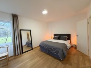 Hall, pièce de séjour avec accès vers la cour empierrée située le long d’un petit ruisseau, cuisine équipée (vitrocéramique, hotte, évier, frigo, four, lave-vaisselle), buanderie, WC, chaufferie et local technique.Quelques renseignements complémentaires: