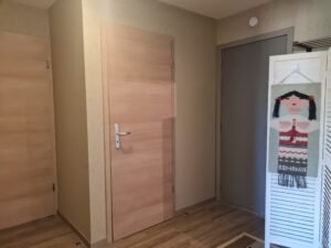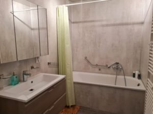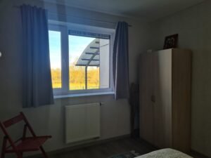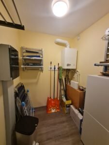 Hall d’entrée, séjour avec coin cuisine équipée (+- 31m²) et accès vers la terrasse et le jardin, 2 chambres, salle de bains (baignoire-douche, lavabo avec meuble), buanderie et WC séparé.